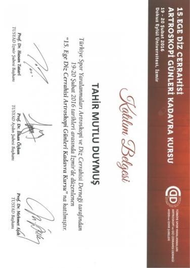 İlk, orta ve lise eğitimini İzmir’de tamamlamayan Tahir Mutlu DUYMUŞ, 2005 yılında Tıp Fakültesinden mezun oldu. İstanbul Eğitim ve Araştırma Hastanesinde başladığı Ortopedi ve Travmatoloji ihtisasını 2010 yılında tamamladı. 2009 yılında üç ay süreyle New York’ta bulunan Hospital for Special Surgery / Universty of Well Cornel’ de poliklinik ve ameliyathane çalışmalarına eşlik etmiştir. 2012-2017 yılları arasında Kanuni Sultan Süleyman ve Haydarpaşa Numune Eğitim ve Araştırma Hastanelerinde eğitim, akademik ve klinik çalışmalarda bulunmuştur. Primer ilgi alanları diz, kalça ve omuz bölgesi hastalıklarıdır. Ameliyat dışı tedavi yöntemlerine önem vermekle birlikte kapalı (artroskopik) diz ve omuz ameliyatları konusunda sertifikaları olup ön çapraz bağ, menisküs ve omuz yırtıklarının tedavisinde, diz ve kalça protezi ameliyatlarına yoğunlaşmıştır. Sağlık hizmetleri yanında akademik çalışmalarına devam etmektedir. Çalışma Alanları; Diz ve Kalça Eklem Protez Cerrahisi Diz ve Omuz Eklemi Atroskopik Kapalı Ameliyatlar ve Spor Cerrahisi (Menisküs ve Ön Çapraz Bağ Yırtığı) üzerinedir. Bilimsel Kuruluş ve Derneklere Üyelikler Türkiye Spor Yaralanmaları Artroskopi ve Diz Cerrahisi Derneği (TUSYAD) Türk Omurga Derneği (TOD) Türk Ortopedi ve Travmatoloji Eğitim Konseyi (TOTEK) Türk Ortopedi ve Travmatoloji Birliği Derneği (TOTBİD) Türk Tabipler Birliği (TTB) Yabancı Dil: Almanca (orta), İngilizce (iyi)